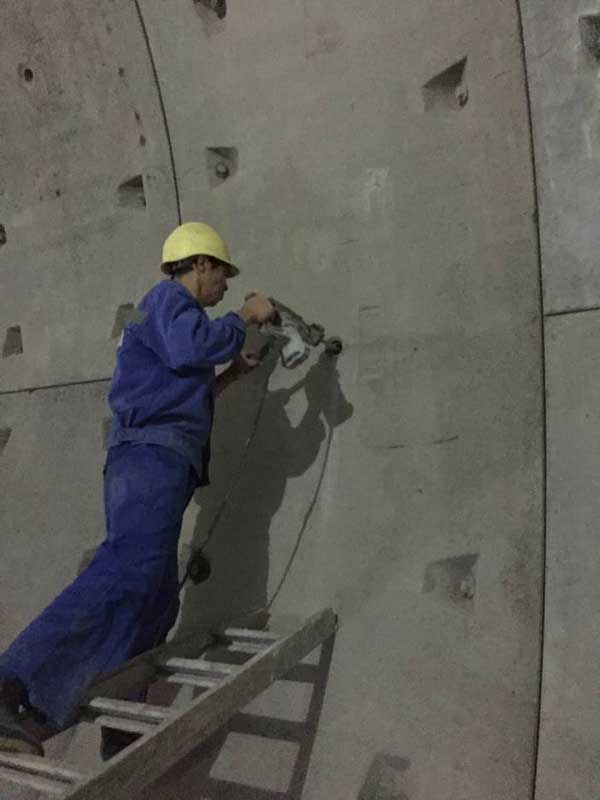 2、对于凿落混凝土面积较大(10cm×10cm),深度超 过2cm,和露筋的(进行除锈处理),管片3点、9点以上考虑 运营安全不进行处理,3点、9点以下位置的管片的首先除掉疏 松混凝土层,对钢筋进行除锈,用压缩空气除去粉尘或用钢丝 刷清理干净,然后对表面进行涂改性环氧树脂,再用改性环氧 砂浆修补平整基层面。待修补处完全干透后,然后打膨胀螺丝 挂镀锌电焊网(镀锌电焊网规格:1.0×1.0㎝ ),按间距8cm 打一个入管片固定镀锌电焊网(提供破损部位修补后承载力,防 顶部损坏位置修补后脱落情况),挂网处加强其粘接度(涂刷厚 度2mm),保证挂网的承载力,使其牢固。待环氧完全固化 后,在其表面涂刷水泥基防水涂料(即防水胶+防水水泥粉), 使其表面与管片的颜色一致,达到其牢固又美观的效果。